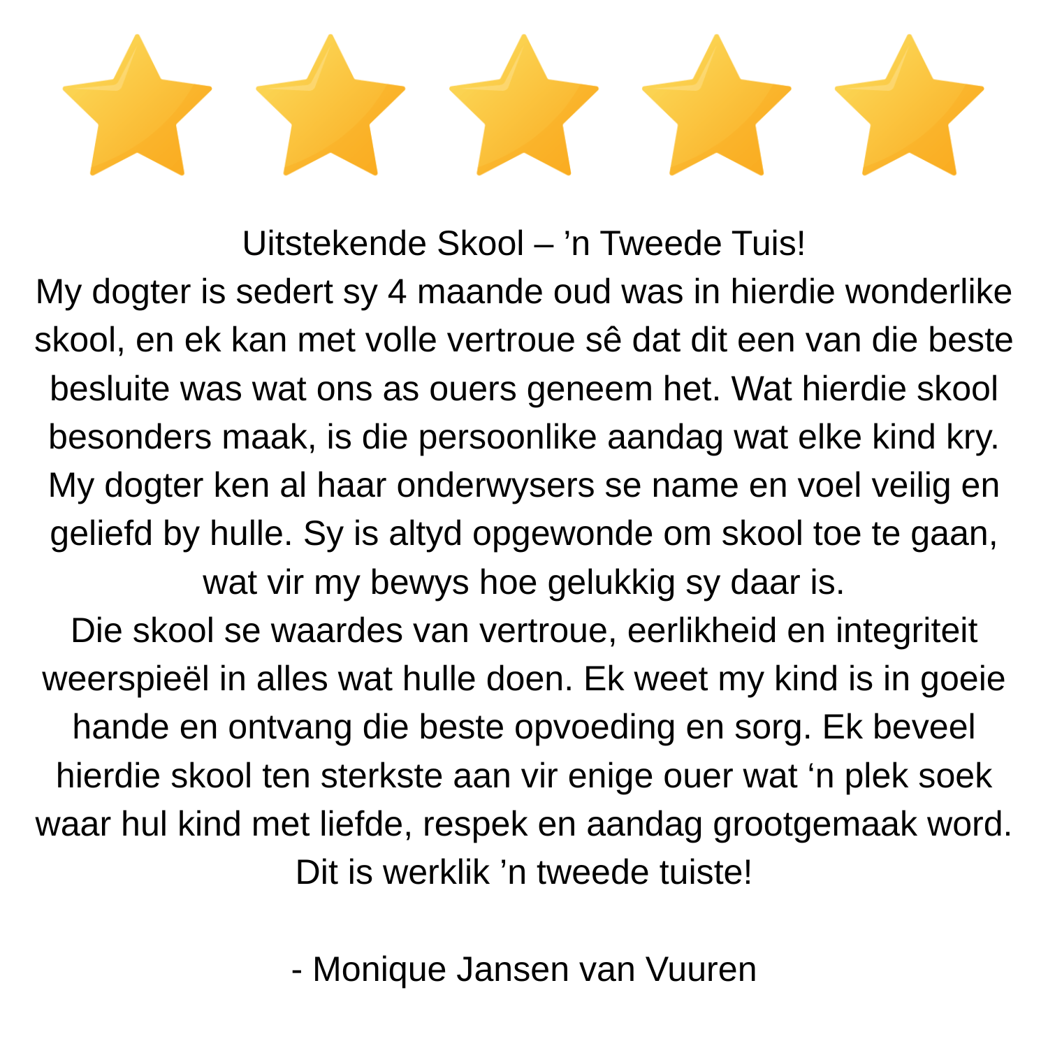 Ons toegewyde onderwysers is die hart van ons kampus – ervare, liefdevol en passievol oor vroeë kinderontwikkeling. Hulle skep ’n veilige en inklusiewe ruimte waar elke kind gesien, gehoor en aangemoedig word om hul volle potensiaal te bereik.
